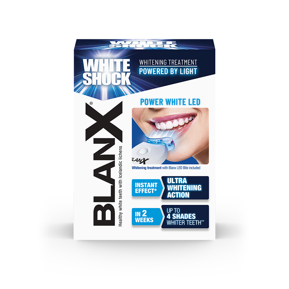 BlanX® Power White Led posvetli vaše zobe do 4 odtenke v dveh tednih** zahvaljujoč združeni moči naprave BlanX® LED Bite in visoki vsebnosti aktivne sestavine ActiluX®.
